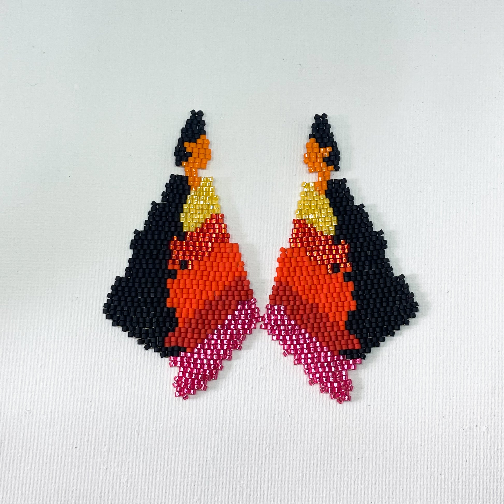 Aretes inspirados en el colibrí Igneo. Aretes tejidos 100% a mano con un tiempo de elaboración de 8 horas hechos con cristal japonés Miyuki, hilo de cera y aguja. Topos en acero recubiertos por tejido en Miyuki.