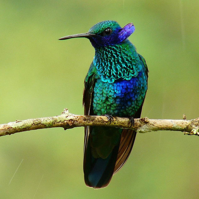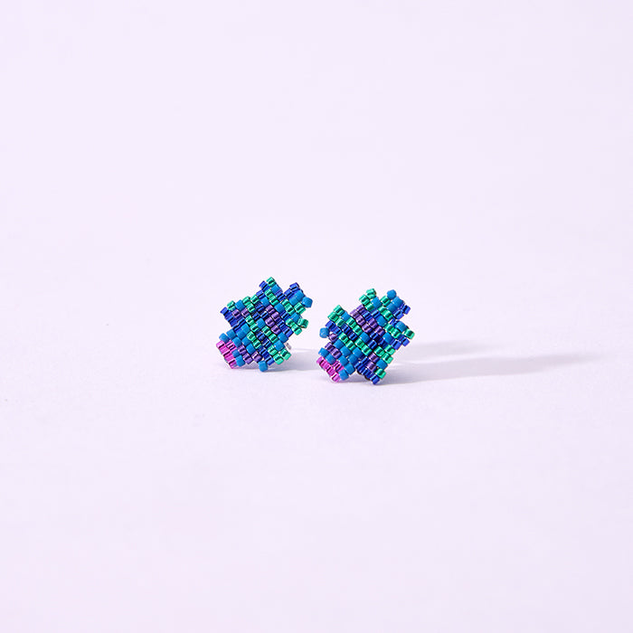Aretes inspirados en el colibrí Coruscans. Aretes tejidos 100% a mano hechos con cristal japonés Miyuki, hilo de cera y aguja. Topos en acero recubiertos por tejido en Miyuki.