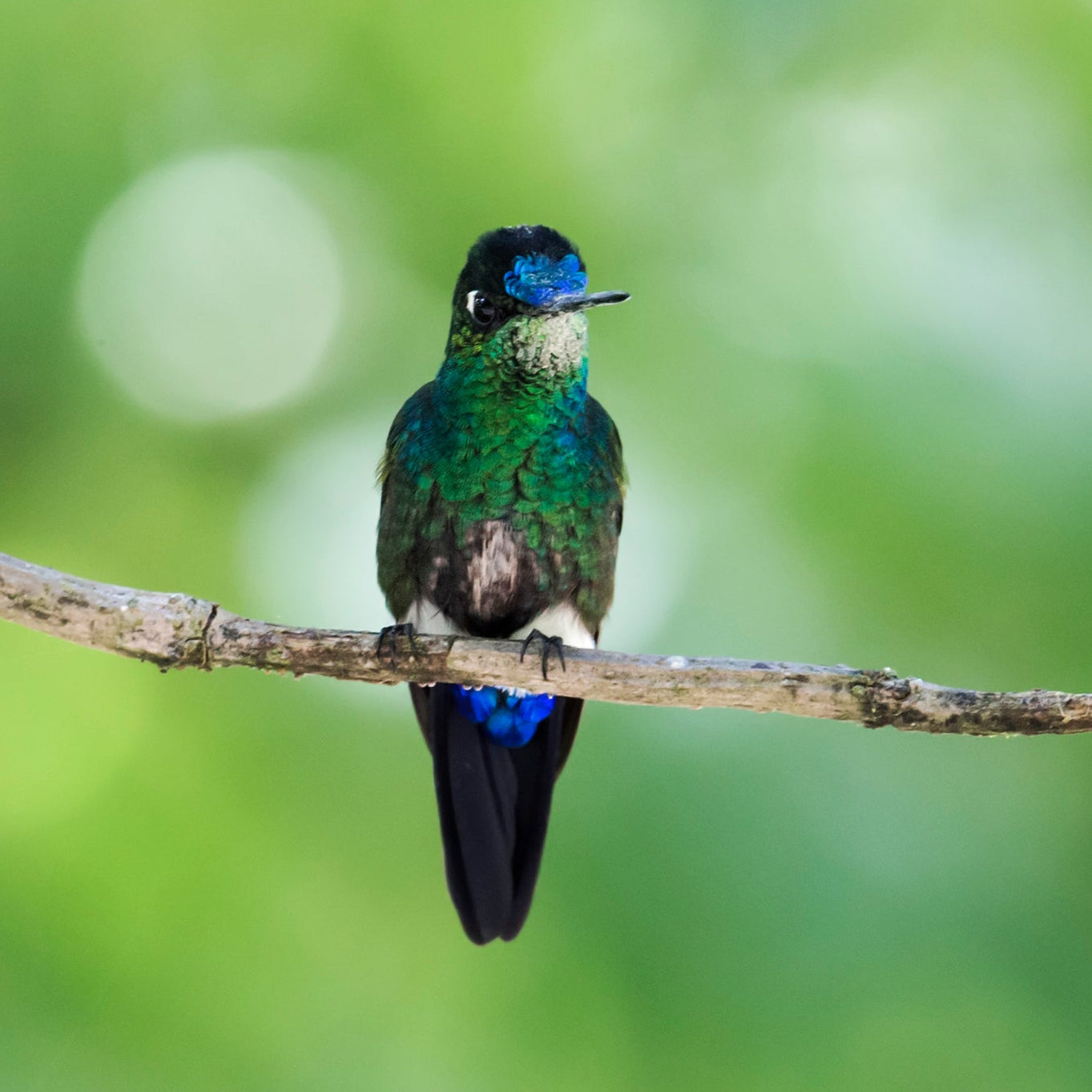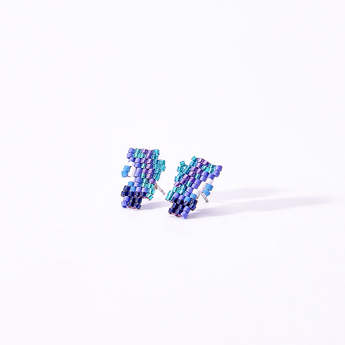 Aretes inspirados en el colibrí Frentiazul. Aretes tejidos 100% a mano, hechos con cristal japonés Miyuki, hilo de cera y aguja. Topos en acero recubiertos por tejido en Miyuki.