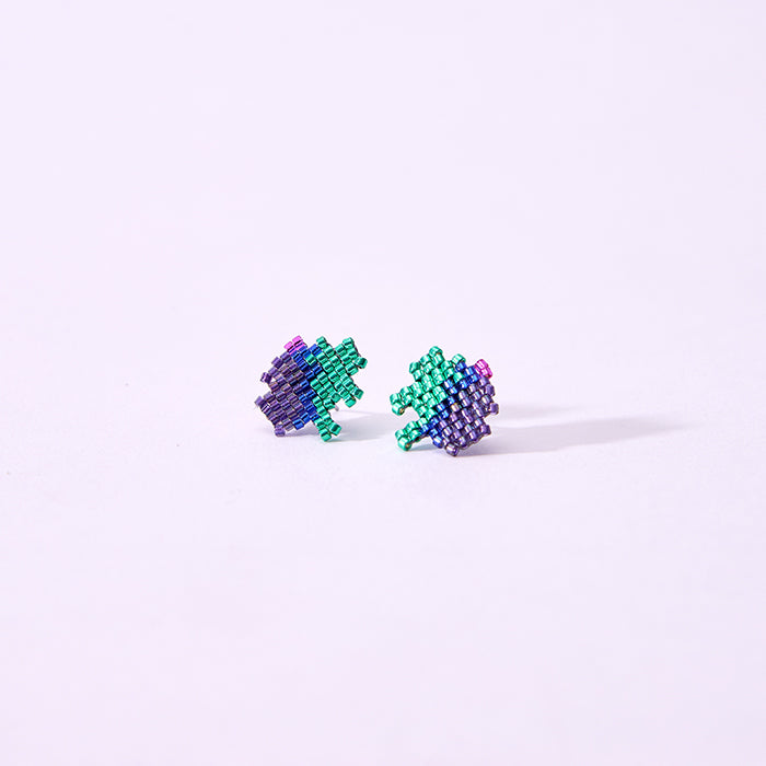Zafiro Coronado. Aretes tejidos 100% a mano, hechos con cristal japonés Miyuki, hilo de cera y aguja. Topos en acero recubiertos por tejido en Miyuki.